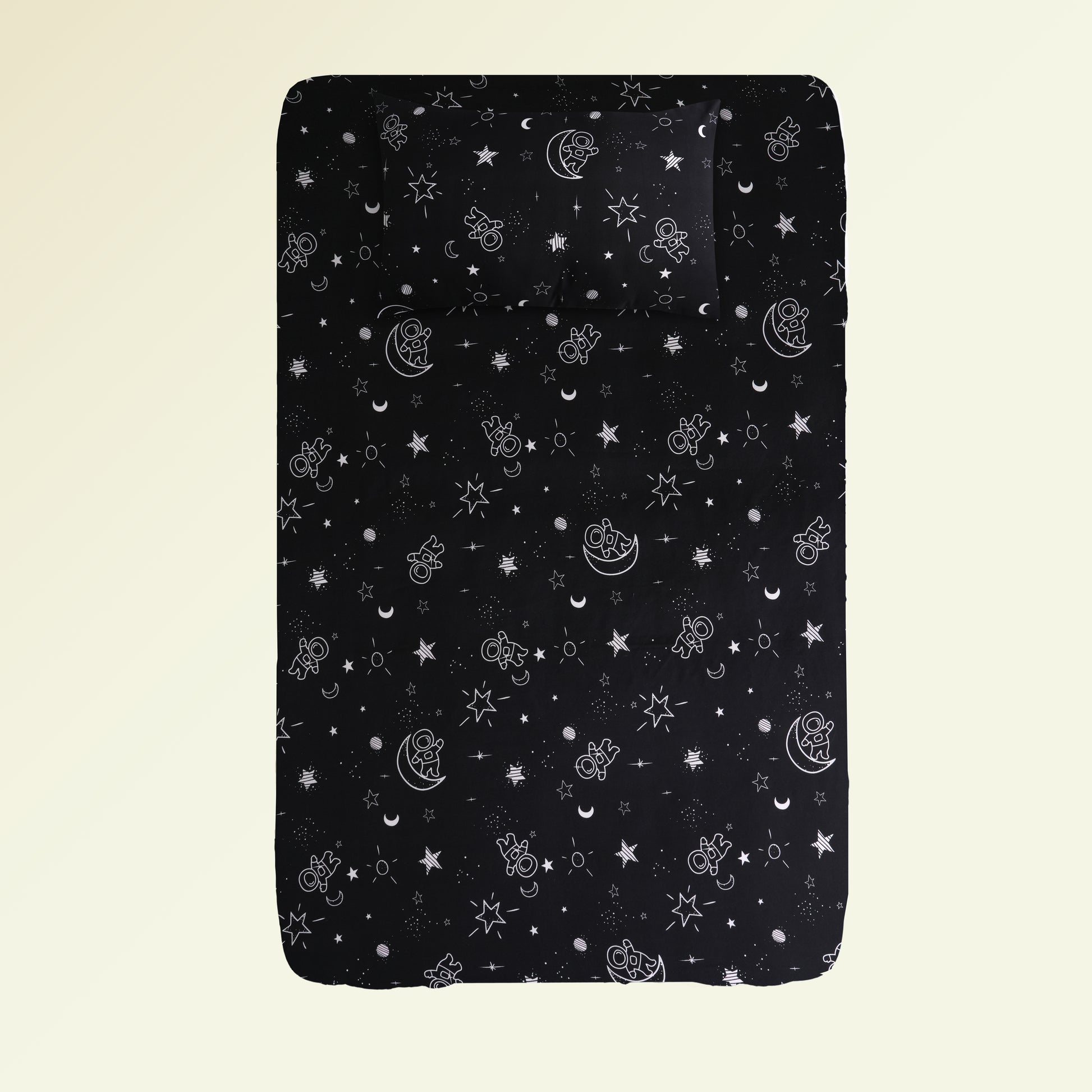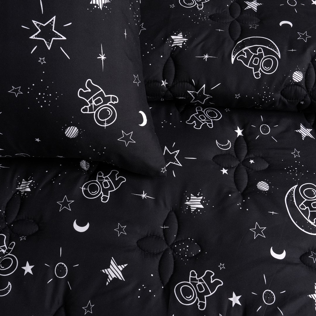 Bring joy to your child's room with the galaxy-printed bed set, offering both comfort and adventure-filled dreams. Crafted from ultra-soft, breathable fabric, this comforter ensures a cozy and fun sleep experience. Perfect for toddlers and young kids who love animated adventures and cozy naps.